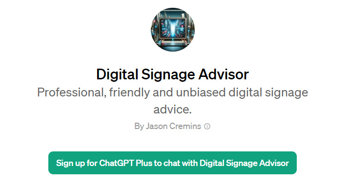 Digital Signage Advisor GPT can be found here: https://chat.openai.com/g/g-9AE6c4IoC-digital-signage-advisor