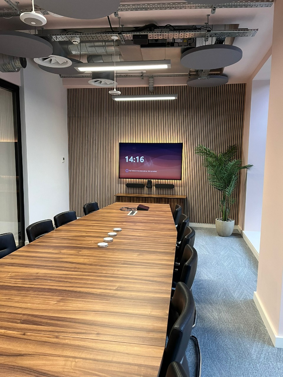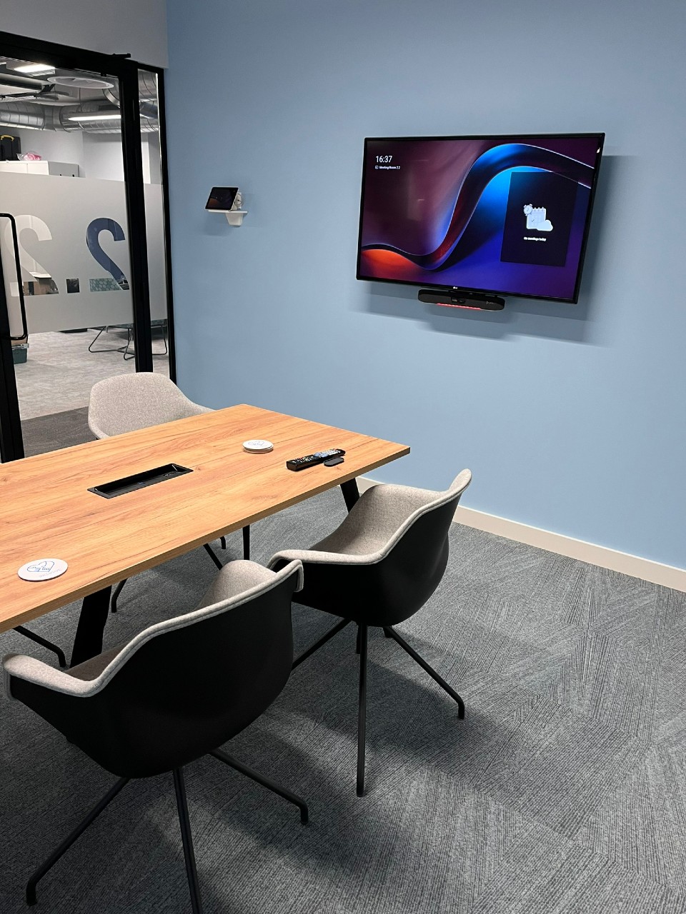 Each meeting room has been equipped with a 49” LG displays, the Poly X30 and TC8 touchscreens to facilitate videoconferencing. In the rooms that required display only, an HDMI runs from the screen to table for presentations.